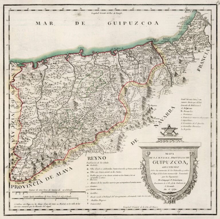 This map was created by Spanish cartographer Tomás López de Vargas Machuca in 1770 and published posthumously by his sons in the “Geographical Atlas of Spain” from 1804. The map depicts the province of Guipúzcoa with the territorial boundaries prior to the provincial administrative reform carried out by Javier de Burgos in 1833.