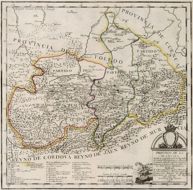 The former Province of La Mancha bordered to the north with the province of Toledo and the province of Cuenca, to the southeast with the Kingdom of Murcia, to the south with the Kingdom of Jaén and the Kingdom of Córdoba and to the west with the province of Extremadura.