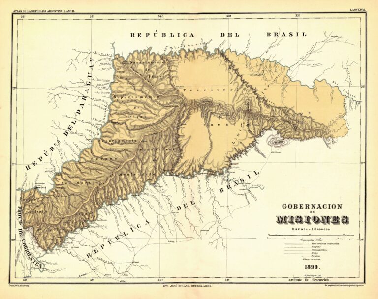 Entitled «Governorate of Misiones,» the map includes the territory that was then known as the National Territory of Misiones. This included the current province of Misiones and also a territory to the east that was disputed with Brazil, which appears labelled on the map as «territory in question». This territorial dispute continued until 1895, when it was submitted to international arbitration led by Grover Cleveland, President of the United States, who ruled in favour of Brazil.