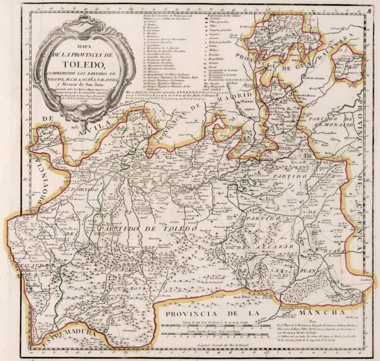 The ancient province of Toledo bordered the northwest with the province of Ávila, to the north with the province of Madrid, to the northeast with the Guadalajara province, to the east with the province of Cuenca, to the south with the province of La Mancha and to the south-west with the province of Extremadura.