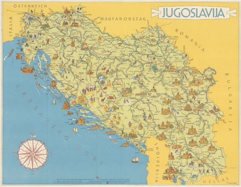 This map, created by painter Slavko Kopač, was published in 1954 as a pocket tourist map for visitors to Yugoslavia.