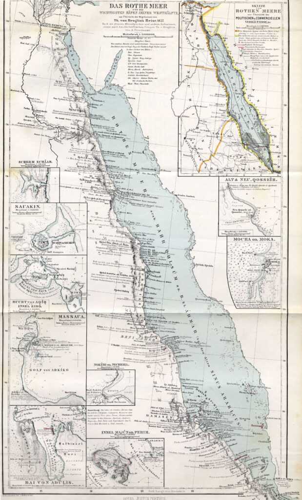 It is clear that Petermann had a great deal of information about the western coast of the Red Sea, given the high level of detail of this coast compared to the eastern coast. In the upper left map, the author shows the countries that occupied this territory at that time, with Egypt and its dependencies shown in orange and the Ottoman Empire and its dependencies in yellow.