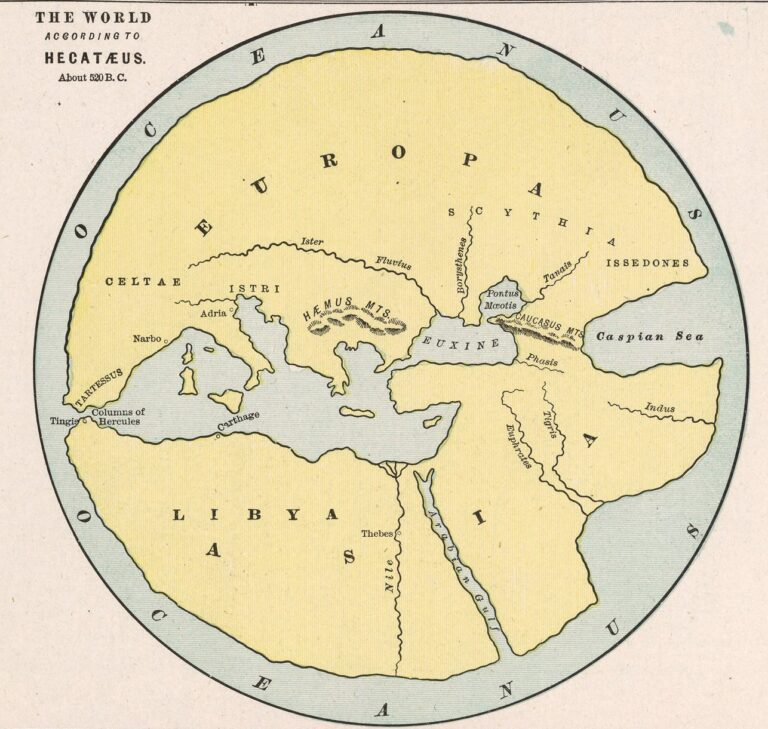 This is a copy of the world map according to Hecataeus of Miletus, published by George Franklin Cram in his 1901 atlas. Hecataeus' map is one of the best representations of the ideas established by Anaximander's map, of which no copy has survived to this day.