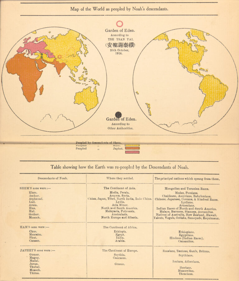 This map, published by Tse Tsan Tai, depicts the world divided among the descendants of Noah's three sons. The illustration is part of a book published in 1914, in which the Chinese journalist and reformist sought to prove that the Garden of Eden was located in Asia. In fact, the map shows Tse's estimated location at the red dot west of China.