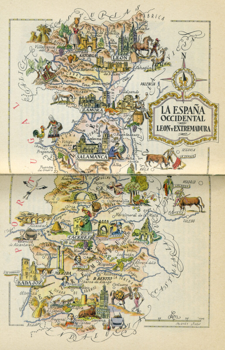 This illustration is dedicated to Extremadura and the Community of León, which at that time consisted of the provinces of Salamanca, Zamora and León. The map explores its main monuments, historical figures, details of agriculture and industry, and some insights into its culture.
