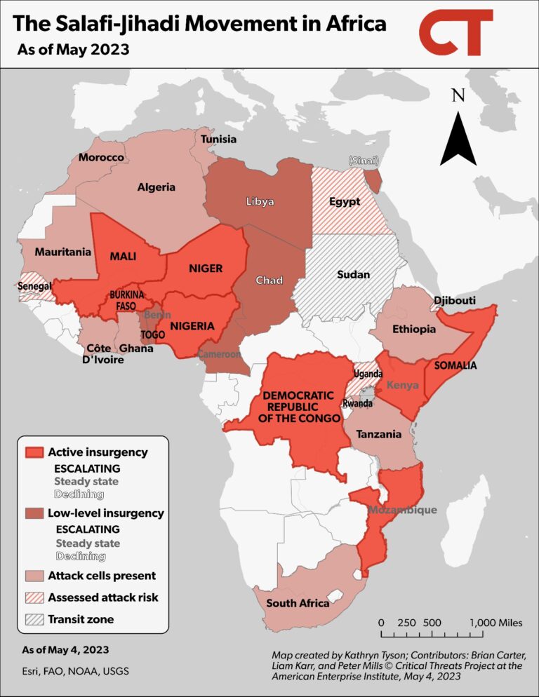 This map, created by Kathryn Tyson for Critical Threats, shows the situation of jihadism and Salafism in Africa as of May 2023.