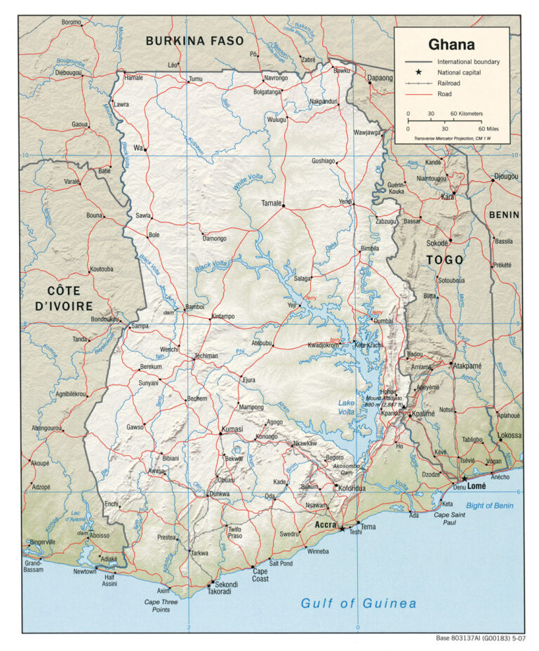 This map of Ghana was published by the CIA in 2007 and is currently held in the cartographic collection at the Perry-Castañeda Library (PCL) at the University of Texas at Austin, United States.