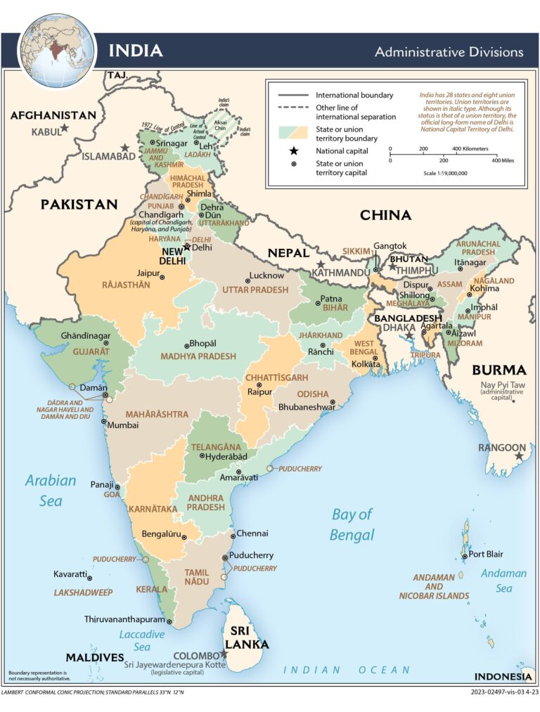 The map shows the territory of the Asian country, with its 28 states painted in different colours. In addition, labelled in brown and italics, are the eight union territories established in 2020, which are governed directly by the central government: Delhi, Jammu and Kashmir, Ladakh, Andaman and Nicobar Islands, Chandigarh, Dadra and Nagar Haveli and Daman and Diu, Lakshadweep, and Puducherry.