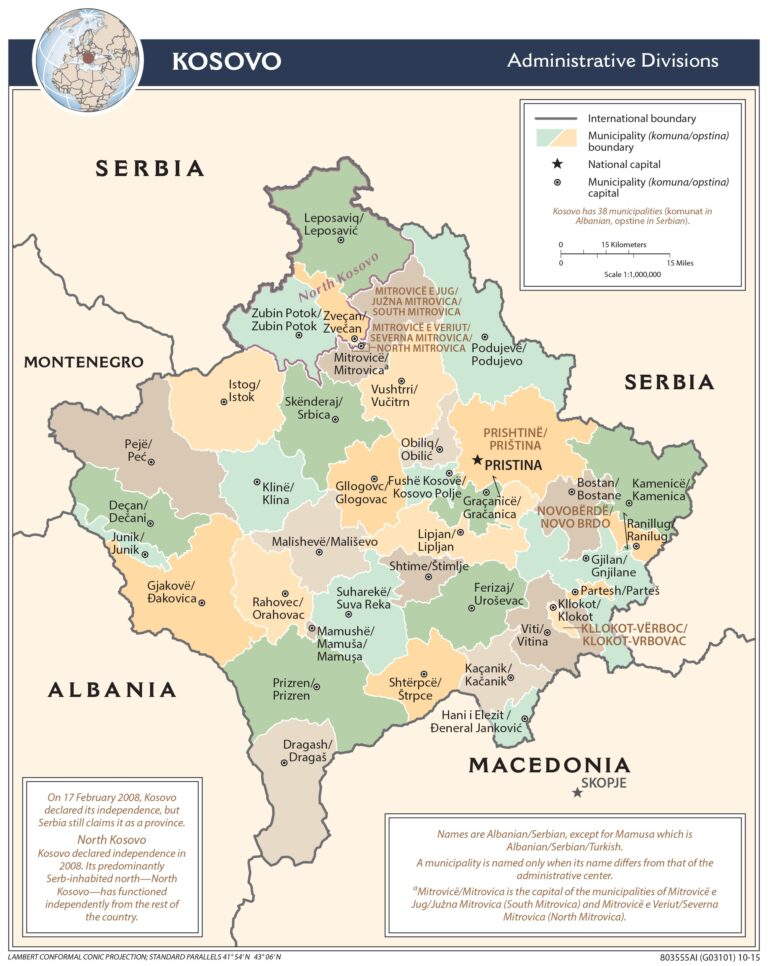 The map shows the territory of the European country, with the 38 municipalities (opstina) that make it up, painted in different colours.