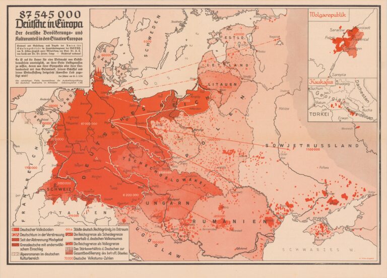 The propaganda objective of this map is to show the influence of German culture in Europe and how German citizens were scattered throughout the continent. This idea was used by the Nazi Party in the years leading up to the Second World War to justify the annexation of Austria (which already appears annexed on this map), the takeover of Bohemia and Moravia in early 1939, and finally the invasion of Poland in 1939.
