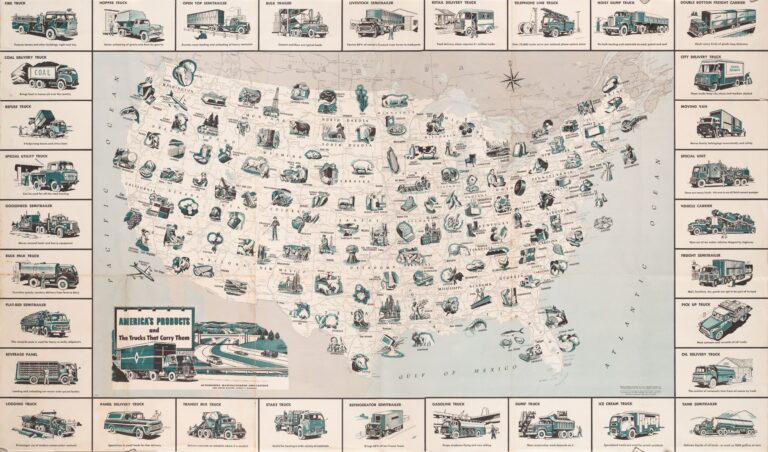 The pictorial map shows the most typical products of each region, but intentionally limits widely available products to specific regions in order to convey a sense of need for transport that is not always necessary. In addition, on the outside, the association included 32 types of lorries that were being manufactured by various members and that could benefit American society if the interstate motorway system were improved.