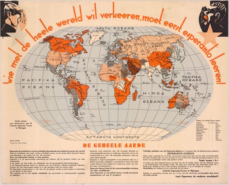 Both the title at the top, If you want to communicate with the whole world, you must first learn Esperanto! (Anyone who wants to get along with everyone should first learn Esperanto); like the course description at the bottom, they are written in Dutch. But all the labels on the map, countries, seas, continents or islands, are written in Esperanto.