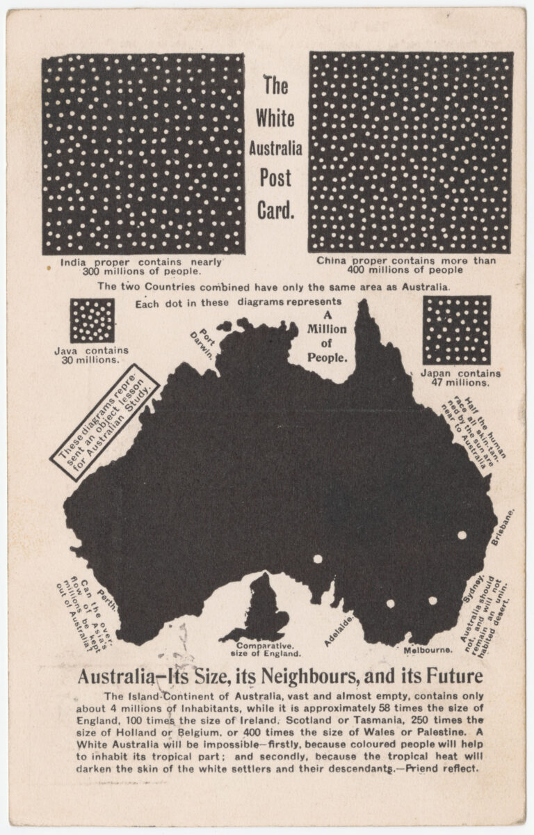 Cole's postcard is part of his particular propaganda campaign against White Australia. To this end, he compares the population of Australia, which at that time numbered only 4 million, with that of other regions such as India (300 million), China (400 million), the island of Java (30 million) and Japan (47 million). The text at the bottom also refers to Australia's large size and vast expanses of uninhabited areas.