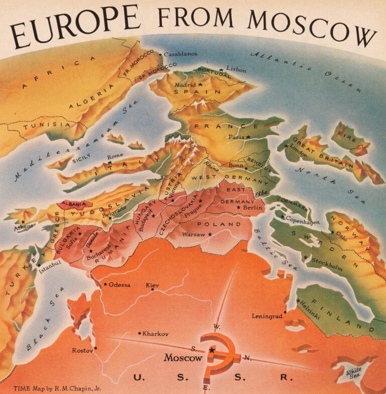 This propaganda map, created by Robert M. Chapin, was published in TIME magazine on 10 March 1952 alongside another entitled “Asia from Irkutsk”.