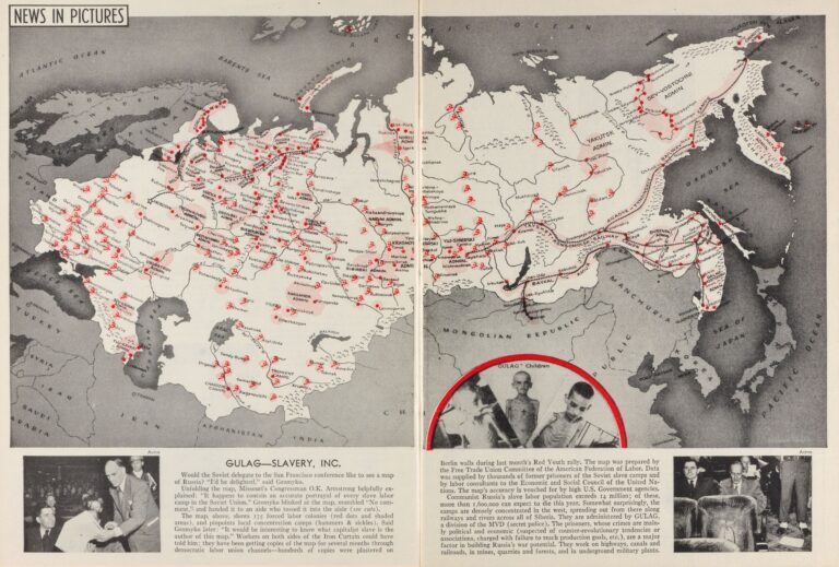 This map was created by Isaac Don Levine for an anti-communist propaganda campaign by the American Federation of Labour. The illustration locates the various labour camps, gulags, that existed throughout the Soviet Union.