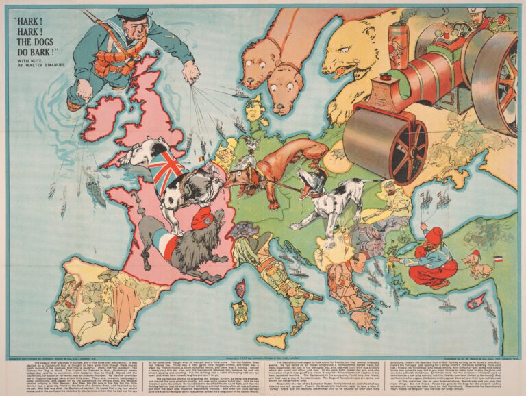 The map is entitled Hark! Hark! The Dogs Do Bark, which refers to a nursery rhyme, which can be translated as “Listen! Listen! The dogs are barking.” This nursery rhyme refers to when the dogs in a village bark when a stranger arrives, and on the map, the dogs represent the conflict in the early months of the war in Europe. The only two countries represented by an animal other than a dog are the Russian Empire, with its characteristic bear, and Spain, with its characteristic bull.