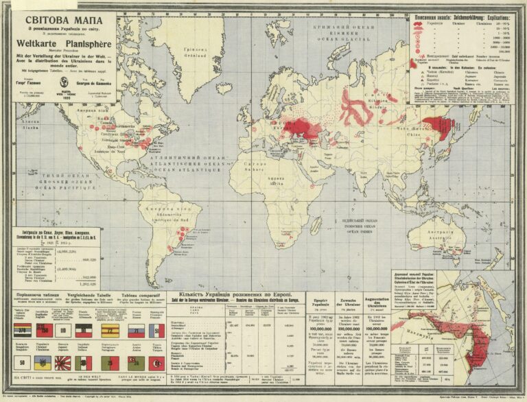 This map, created by Georg Hasenko and published in Vienna in 1920, shows the distribution of Ukrainians around the world.