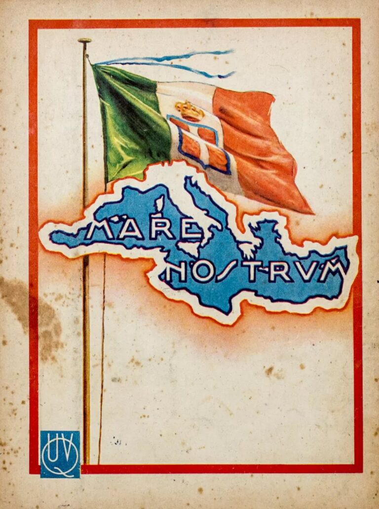 This particular copy belongs to a fifth-grade school notebook belonging to a pupil from the village of Canepina, in the Lazio region. The map shows the flag of Fascist Italy flying over a map of the Mediterranean Sea, which is labelled as Our Sea.