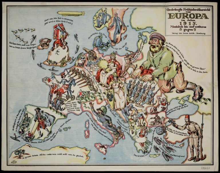 This is a piece of propaganda published by the Central Powers (German Empire, Austro-Hungarian Empire and Ottoman Empire), in which enemy countries are depicted as naive and stupid: