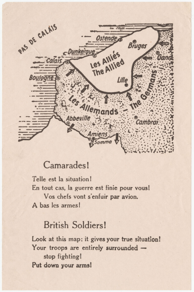 In both messages, the pamphlet was being used as a means to connect with low morale and despair, and thus prevent this final battle from causing effort or casualties for the German army. It is difficult to determine to what extent this propaganda had any real effect, as a significant portion of the Allies managed to escape the siege thanks to the success of Operation Dynamo, which evacuated Dunkirk.