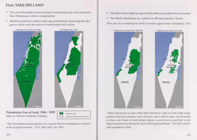 This map is one of the most popular ones used on the Internet throughout the 21st century to discuss the conflict between Palestine and Israel. It first appeared in the book A Puppy Dies, published in 2003 by Anglican Reverend Timothy Biles. In the book, the author cites the British organisation Palestine Solidarity Campaign (PSC) as the source of the map, although this has never been verified.