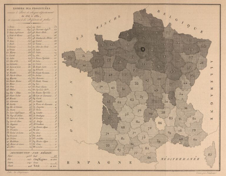 The second half of the 19th century is commonly considered the golden age of statistical data representation, and this is an example of its beginnings. The map shows all French departments marked with different colour intensities depending on the number of women engaged in prostitution who were born in each one.
