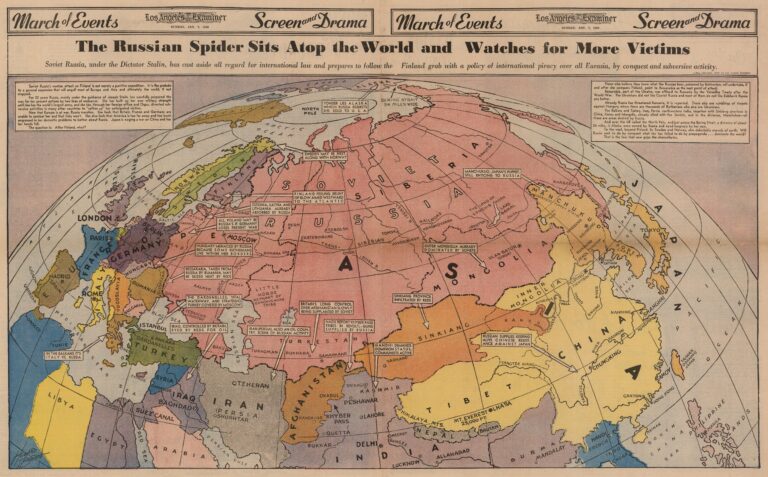 This map, entitled “The Russian spider sits atop the world and seeks more victims.”, was part of the United States' anti-communist propaganda campaign. In 1940, the Soviet Union still maintained its non-aggression pact with Nazi Germany, thereby becoming a de facto enemy of the Allies. The United States had not yet entered the war, but propaganda such as this sought to pressure the government to join the Allies.