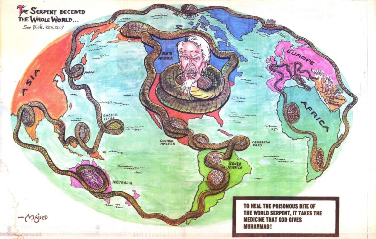In the lower right corner, as a solution, he suggests that God, Muhammad, and the precepts of Islam are the medicine that cures the world of a poisonous snake like this one.