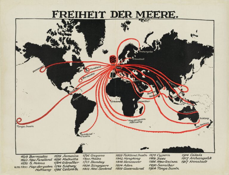 The map is heavily laden with propaganda, as it attempts to portray the British Empire as a power that has conquered every corner of the seas over the centuries, thereby depriving other nations of the freedom to sail the oceans.