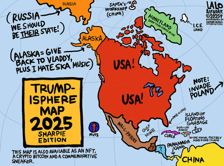 This map, published by the cartoonist Lalo Alcaraz in 2025, shows a comical representation of the world according to Donald Trump.