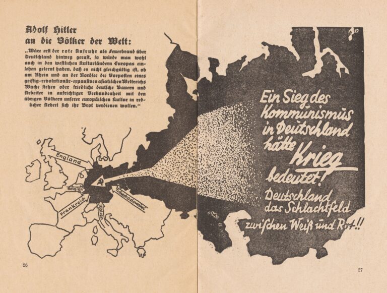 This map shows the advance of communism from Eastern Europe, with the support of the Soviet Union. The text on the right-hand side, written in German, states that A victory for communism would mean war, and Germany would become the battlefield between the Whites and the Reds.. The reds refer to communism and the whites to capitalism, the other great enemy of the Nazi Party.