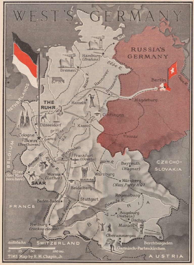 This propaganda map, drawn by Robert M. Chapin and published in the magazine Time in 1949, shows the division of the two Germanys.