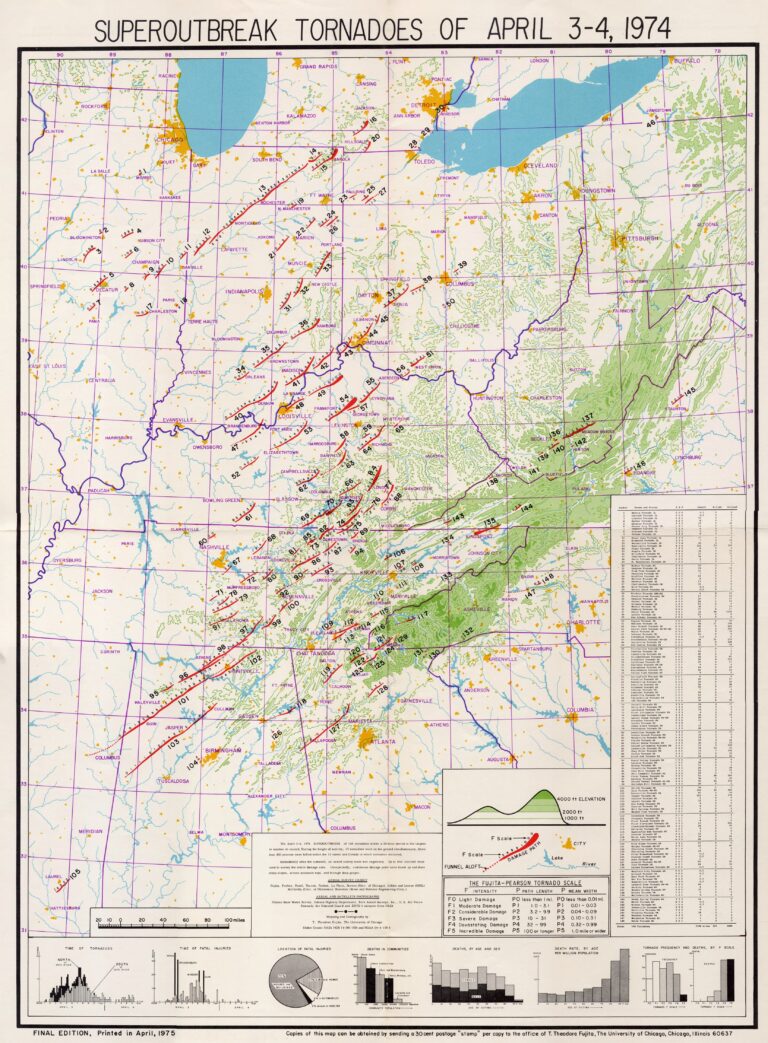 This map, published by Tetsuya Theodore “Ted” Fujita in 1975, depicts the Super Outbreak of tornadoes that took place in...