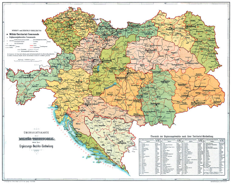 This map, published by the Imperial and Royal Military Geographical Institute in 1894, shows the administrative divisions of the Austro-Hungarian Empire's army. The...