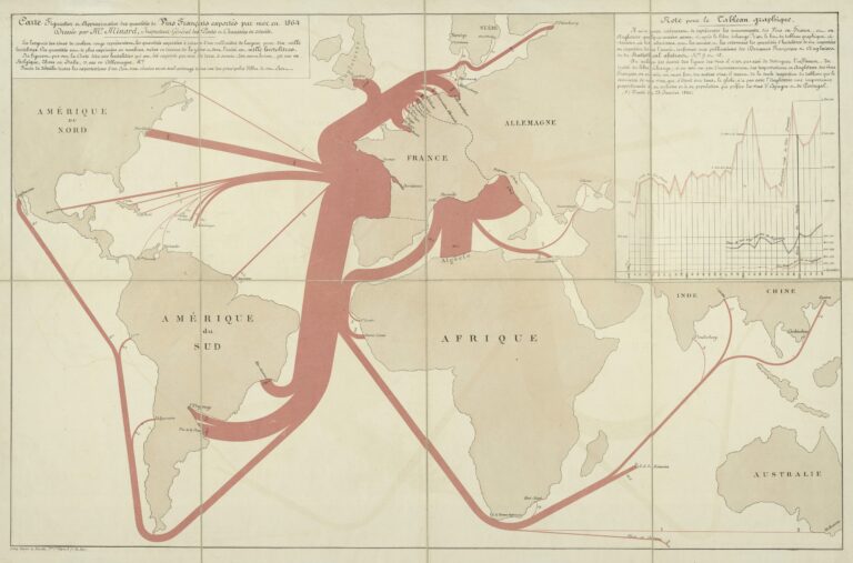 This map, published by Frenchman Charles Joseph Minard in 1864, represents an approximation of French wine exports...