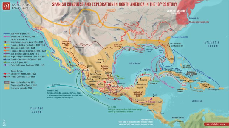 This map, published by Simeon Netchev for World History Encyclopedia, shows the expeditions and conquests of the Spanish Empire in North America from...