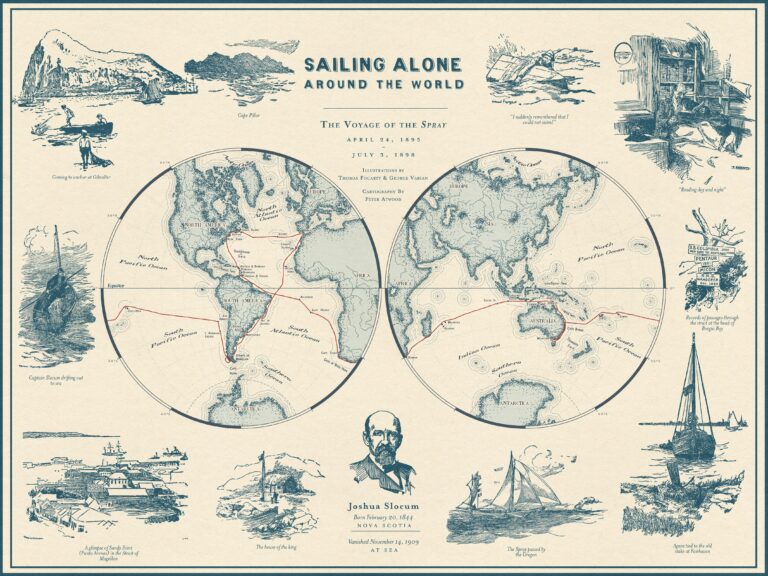 This map, created by Peter Atwood in 2022, shows the route taken by Joshua Slocum for the first solo circumnavigation of the...