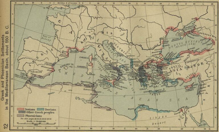 Este mapa, publicado por William Shepherd dentro de su Historical Atlas de 1926, muestra los distintos asentamientos y colonias griegas y fenicias a lo largo de las costas del mar Mediterráneo alrededor del 550 a. C.