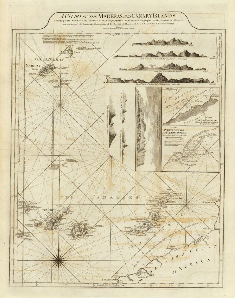 En la parte superior derecha, también se incluye un detalle del estrecho del Río, que separa Lanzarote y la Graciosa; un detalle de Puerto Naos y Puerto Cavallo, en Lanzarote, y los relieves de muchas de las islas representadas en el mapa desde distintas perspectivas.
