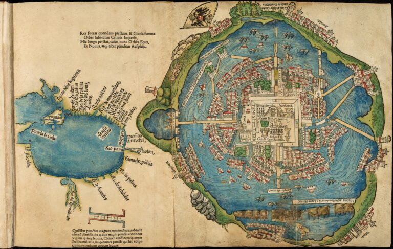 Este mapa de Tenochtitlan es una reproducción alemana de 1524 del mapa realizado por Hernán Cortés y enviado a Carlos I (y V de Alemania) en la segunda de las cinco cartas enviadas al monarca.