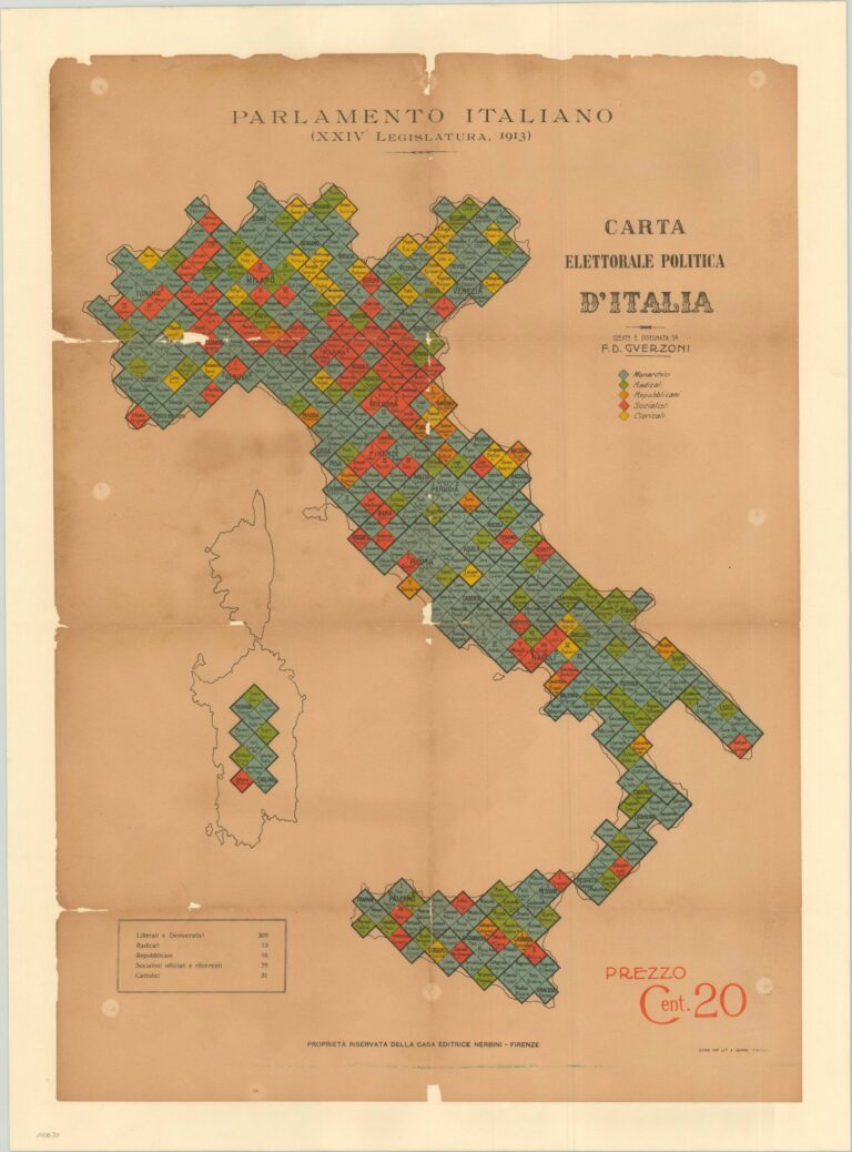 Este mapa fue creado por F. D. Guerzoni y publicado por la editorial Nerbini en 1913. El objetivo de esta copia era mostrar al ciudadano de a pie los resultados de las elecciones generales de Italia del 2 de noviembre de aquel mismo año.
