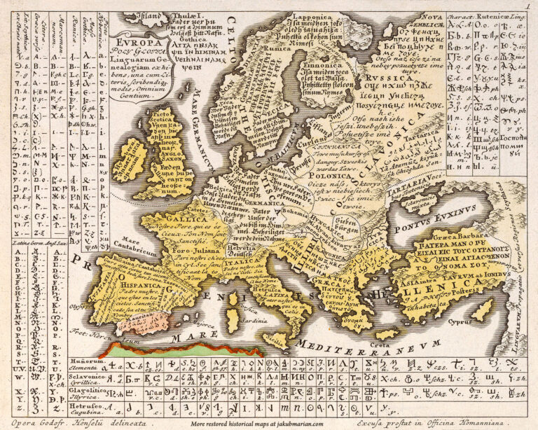 Este mapa, creado por Gottfried Hensel en 1741 y restaurado por Jakub Marian en 2018, fue publicado por Homann Erben dentro su libro Synopsis Universae Philologiae (Sinopsis de la filología universal).