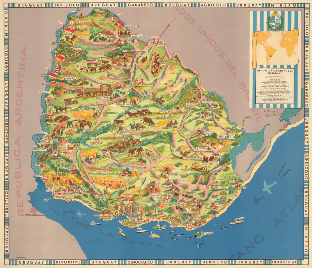 Este mapa, dibujado por P. Pauselli e impreso por la litografía Colombino de Montevideo en 1936, es un mural pictórico de Uruguay.