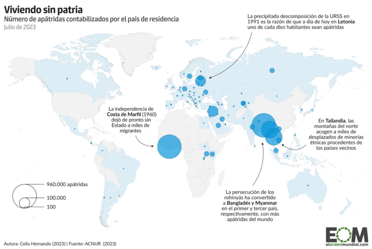 Este mapa, realizado por Celia Hernando para El Orden Mundial, muestra la distribución de apátridas en el mundo en 2023.