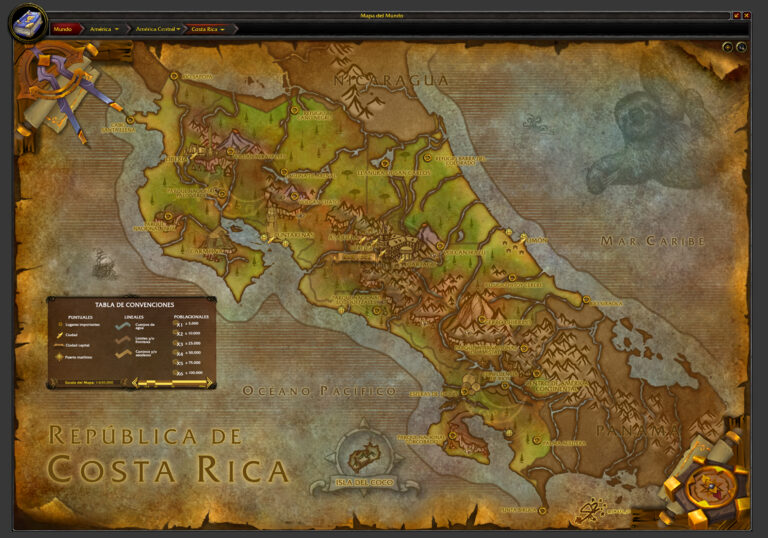 Este mapa, creado por Santiago Reyes en 2024, representa Costa Rica. La ilustración forma parte del proyecto para representar toda Latinoamérica en el estilo del World of Warcraft.