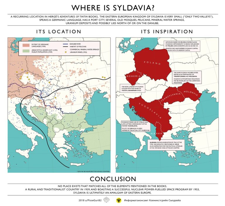 Como el propio autor del mapa apunta, no hay ningún lugar que pueda cumplir la descripción de Syldavia, aunque sí que parece claro que es una amalgama de los países de Europa del Este.