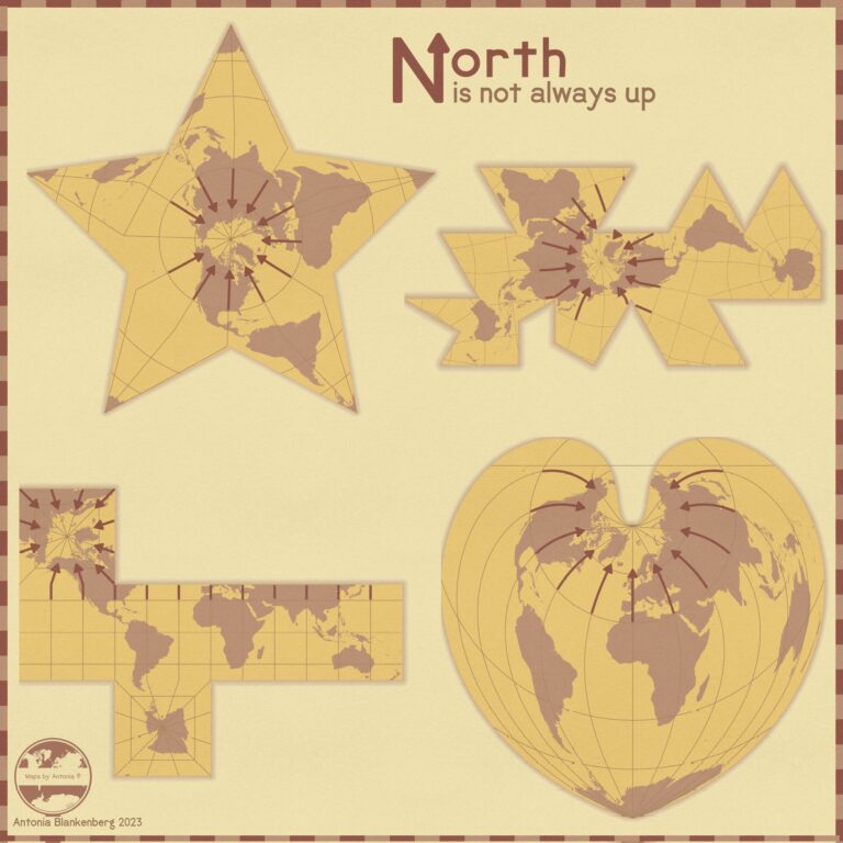 La ilustración de la autora utiliza cuatro proyecciones cartográficas distintas en las que el norte no se sitúa en la parte superior de los mapas: