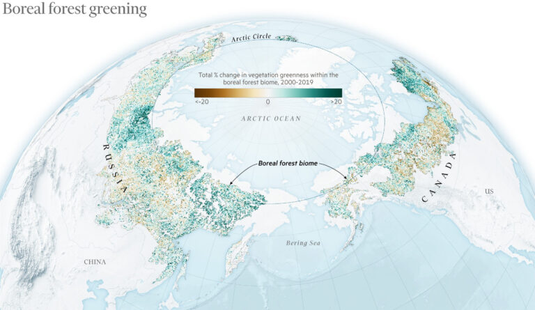 El mapa muestra los cambios en la vegetación de los bosques boreales entre los años 2000 y 2019. Para ello, muestra en distintos tonos de verde los lugares donde aumentó la densidad de árboles y en marrón los lugares que perdieron densidad de árboles.