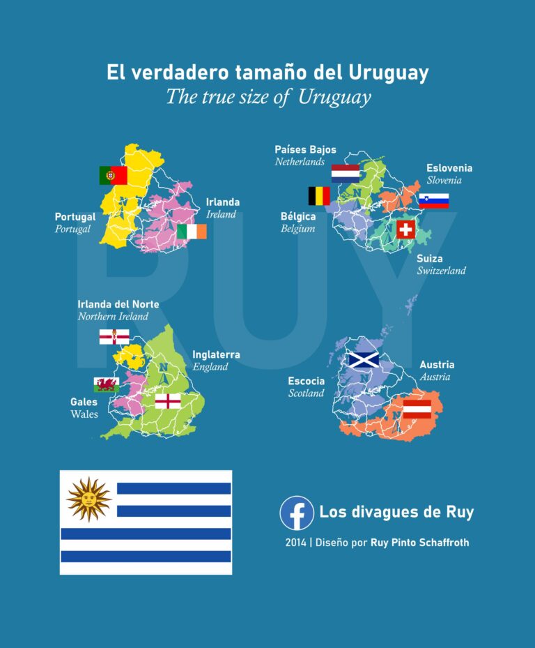 Para ello, muestra cuatro mapas de Uruguay, comparando en cada uno de ellos con distintos países de Europa, para lograr un tamaño aproximado al de Uruguay (176.215 kilómetros cuadrados):