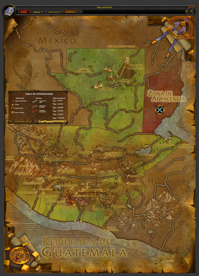 Este mapa, creado por Santiago Reyes en 2024, representa Guatemala. La ilustración forma parte del proyecto para representar toda Latinoamérica en el estilo del World of Warcraft.